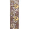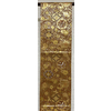 薄手でしなやかな手触りの錦の織りで、緑みの地色に2種類の金糸金箔を重ねた地織りで、花柄を黄赤色やエンジ色に赤紫色などを加え織った品。