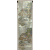 薄手でしなやかな手触りの錦の織りで、青緑色と金箔で霜降りに織り込み、木立や花に家などの柄を緑色や金茶色などで織った品。