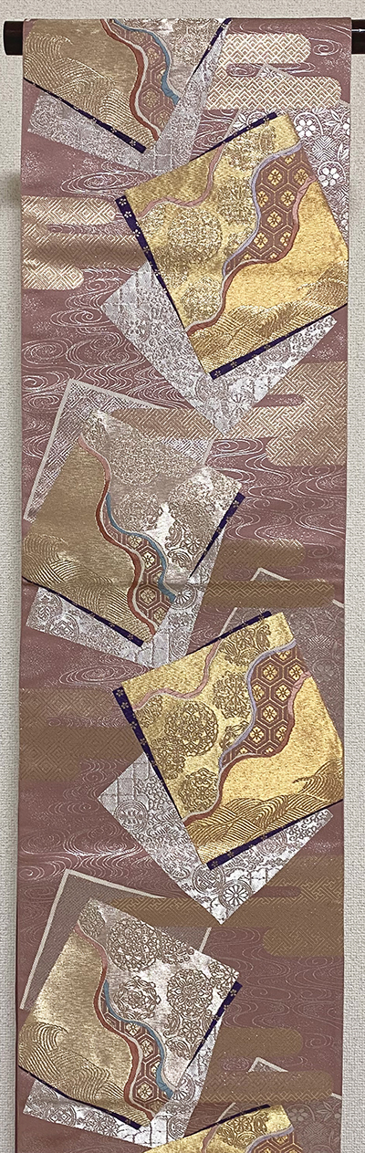 薄手で張りのある錦の地織りで、藤ローズ色の優しい色の地織りに、流水と雲や色紙の柄に花柄を加え金糸金箔と銀糸銀箔に少しの青色や紫色などを加えて織った品。