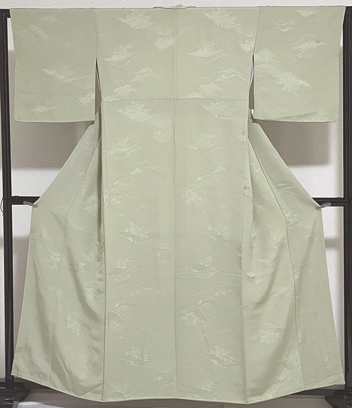 スベリの良い手触りの山並みの地柄を織り込んだ紋意匠の生地をくすんだウグイス色無地で染め上げた品。八掛けは正絹表色無地で胴裏は正絹が付いた手縫い仕立て。