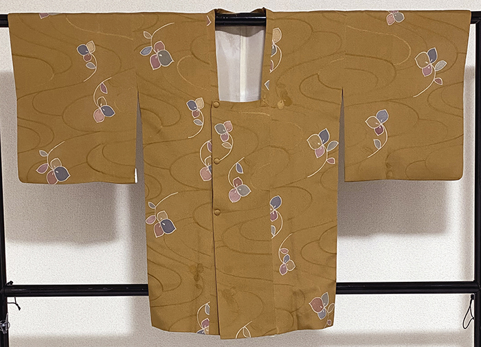 しなやかな手触りの良い流水と花柄を織り込んだ紋意匠生地で、金茶色の地色に、花柄に青ネズ色や薄紫色などを加え染めた品。裏地は正絹が付き、白ネズ色に雲の柄を淡い色で染めた品です。