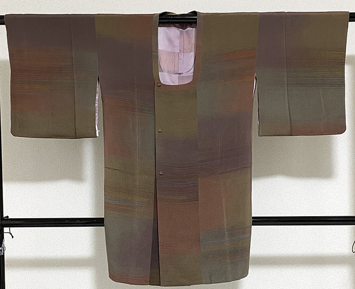 しなやかな手触りの重みのある縮緬織り生地で、くすんだエンジ色や金茶色に青緑色などで横段暈しに染めた品。裏地は正絹が付き、市松織りに薄紫色や青ネズ色などで染めた品です。。都衿仕立て。斉藤三才作、下前竪衿に作家名と落款があります。