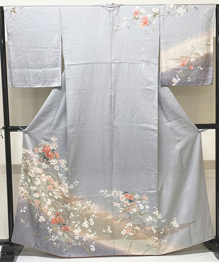 しなやかな手触りの良い小さな市松と小花を織り込んだ紋意匠生地で、銀ネズ色地色に胸や上前などの花車や流水などを珊瑚色や藤ネズ色と金茶色に少しの金彩を加え染めた品。八掛けは正絹淡い珊瑚色暈しで胴裏は正絹が付いた手縫い仕立て。