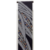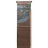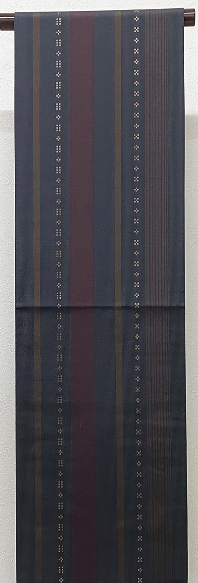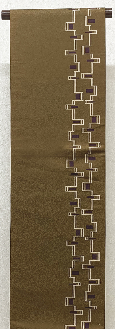 しなやかな良い手触りの真砂の地柄を織り込んだ紋織り地織りで、優しいこげ茶色の地色に、四角繋ぎの線柄をベージュ色と紫色で染めた品。両面仕様。 裏面は、濃いこげ茶色の地色に、小さな四角柄を金彩で染めた品です。 手染屋吉兵衛謹製、タレの返し部分に工房名があります。