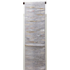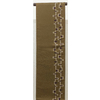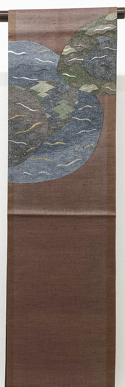 しなやかな手触りの櫛織りで、くすんだ金茶色濃淡で横段に流れる地織りに、お太鼓の蔓葉の柄を黄赤色や青色に薄緑色とこげ茶色などを加え織った品。