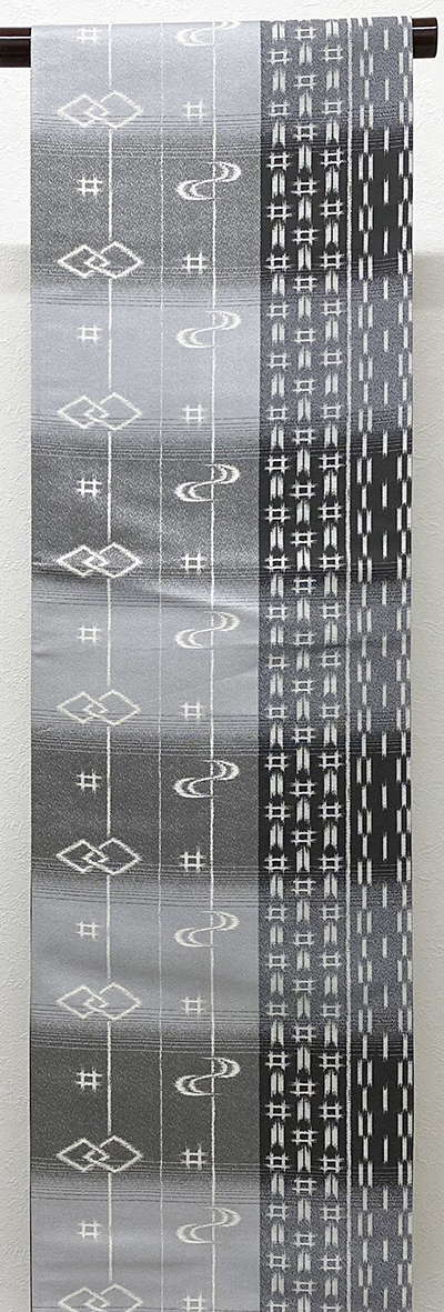しなやかな手触りの紹巴織りで、白ネズ色と墨色で絣柄を織った品。胴から手先の間の部分はきれいなウロコ柄を織ってあります。