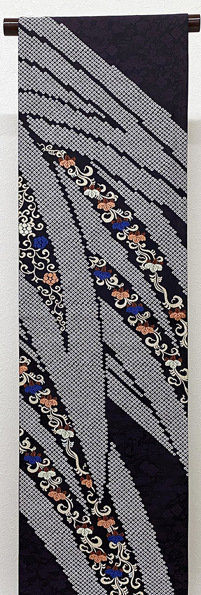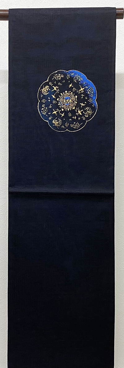 薄手で張りのあるしなやかな上質な織りで、細縞の柄を鉄紺色濃淡に少しのエンジ色を加えた趣のある色に地織りし、お太鼓の丸い花柄と鳳凰や鶴に花柄を金彩で描き、一部に金糸刺繍と青糸刺繍を加えて仕上げた品。
