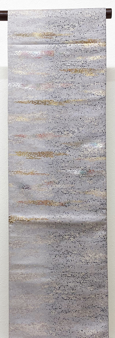 しなやかな手触りの小さな波柄を織り込んだ紹巴織りで、白ネズ色とベージュ色に黒糸で霜降りに織り、お太鼓の横に流れる雲の柄を金銀色と紅色と薄紫色などの色金彩で染めた品。