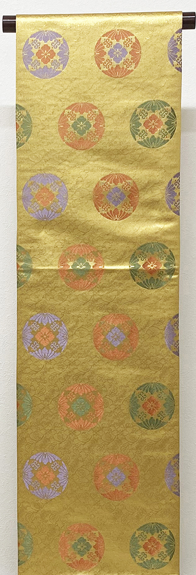 しなやかな手触りのポリエステル織り生地で、金の地織りに、蔓葉の柄を金糸で織り、丸柄を薄紫色やローズ色に緑色などで織った品。