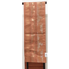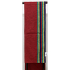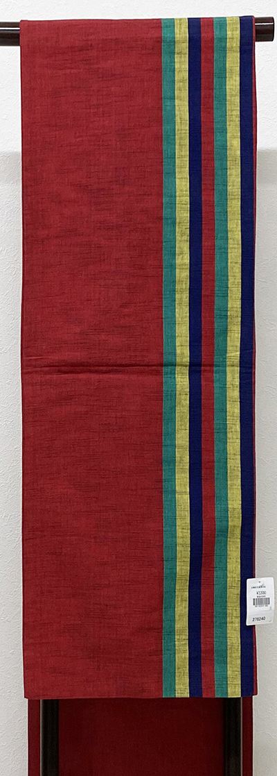 小さなフシを織り込んだ木綿織り生地で、半分をエンジ色の地織りで、残る半分に紺色や緑色に黄色などで縞柄を織った品。京袋仕立て。