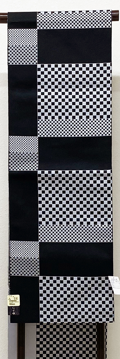 しなやかな手触りのポリエステル織り生地で、黒の地織りに、白ネズ色と少しのこげ茶色を加え横段市松柄を織った品。手先まで平仕立て。