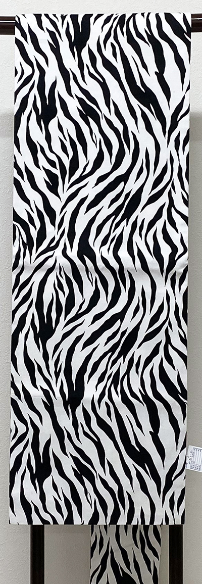しなやかな手触りの木綿織りで、白の地織りに、トラ柄を黒色で染め上げた個性ある品。