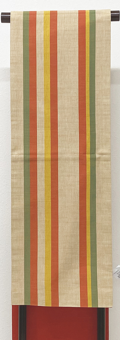 しなやかな手触りの木綿織り生地で、小さなフシを織り込んだベージュ色の地織りに、縦縞取り緑色や赤色の織り分けと、山吹色の縞柄を織った品。京袋仕立て。