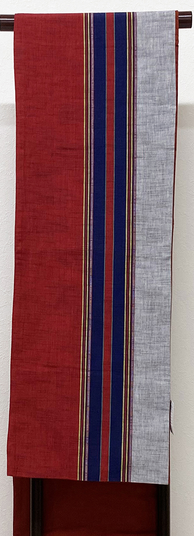 小さなフシを織り込んだ木綿織り生地で、半分をエンジ色の地織りで、残る半分に白ネズ色や紺色に黄色などで縞柄を織った品。京袋仕立て。