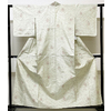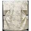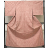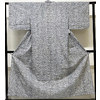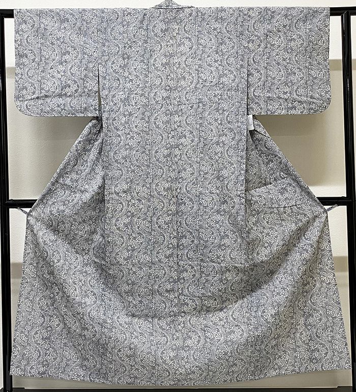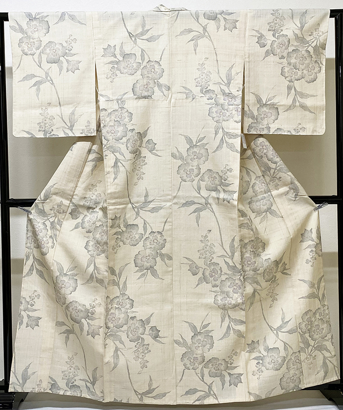 確りした張りのある薄手の少し透けた紬織り生地で、淡いベージュ色の地織りに、大きな花柄を薄ネズ色濃淡と少しの薄小豆色を加えて染めた品。背伏せは別生地が付き、正絹白絽の衿裏が付いた手縫いの単衣仕立て。後ろ身頃の裾に力布が付いた丁寧な仕立ての品です。