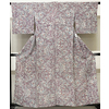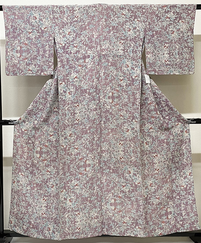 しなやかな手触りの縮緬織り生地で、くすんだ赤紫色の地色に、蔓花柄を青ネズ色と少しの白やエンジ色を加え染めた品。背伏せは別生地が付き、正絹白の衿裏が付いた手縫いの単衣仕立て。