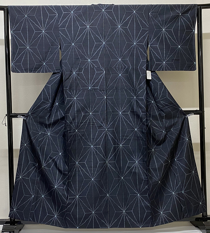 薄手でしなやかな小さなフシを織り込んだ越後紬織り生地で、黒の地織りに、大きな麻の葉の柄を青ネズ色で織った品。腰から下の後幅一杯に正絹居敷当てが付き、正絹白絽の衿裏が付いた手縫いの単衣仕立て。