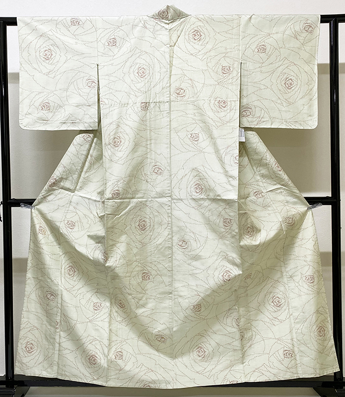 しなやかな手触りの小さなフシを織り込んだ越後紬織り生地で、淡い薄緑色の地織りに、大きなバラの花柄をエンジ色で織った品。背伏せは別生地が付いた手縫いの単衣バチ衿仕立て。