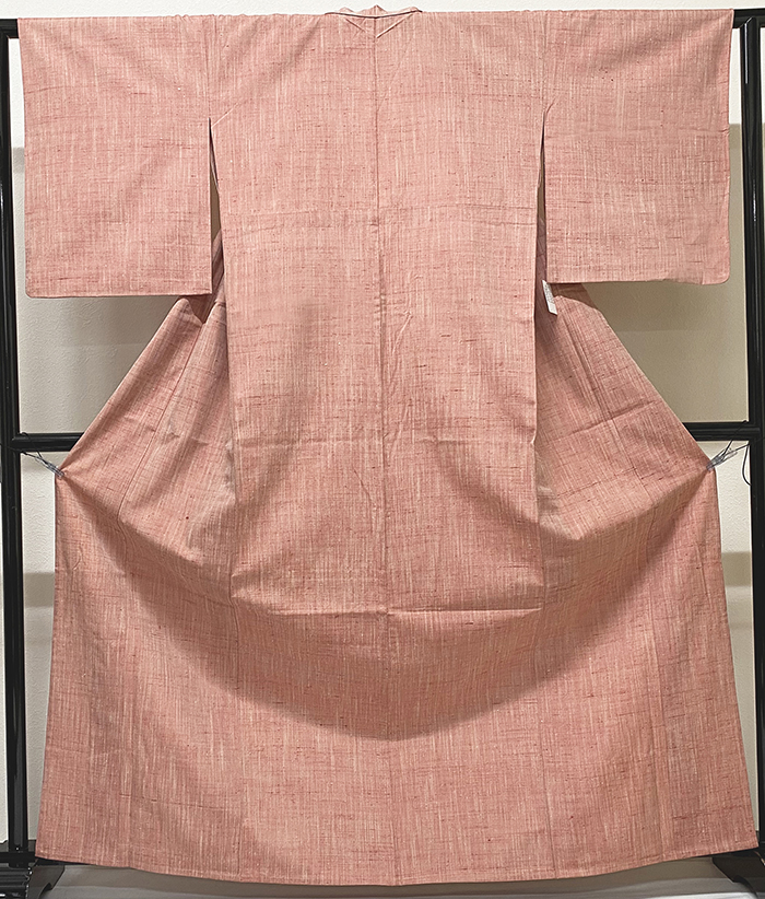 しなやかな手触りの小さなフシを織り込んだ紬織り生地で、くすんだエンジ色に少しの白糸を縦に織り込んだ玉虫織りに織り上げた品。背伏せは別生地が付き、正絹白の衿裏が付いた手縫いの単衣仕立て。衿裏にはホック代わりに糸が付いています。