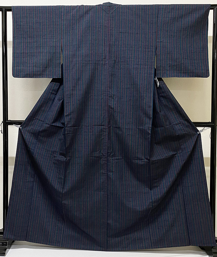 しなやかな手触りの小さなフシを織り込んだ紬織り生地で、濃紺色の地織りに、細縞の柄をエンジ色や緑色などで織った品。背伏せは別生地が付き、正絹白の衿裏が付いた手縫いの単衣仕立て。