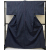しなやかでスベリの良い大島紬織り生地で、黒に近い濃紺色の地織りに、花柄を青ネズ色とエンジ色で織り上げた品。身八つ口から下の後ろ幅一杯に正絹居敷き当てが付き、正絹白の衿裏が付いた手縫いの単衣仕立て。衿裏にはくるみホックが付いています。