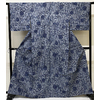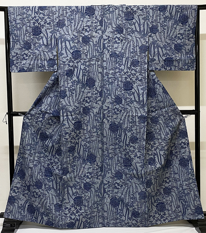 しなやかな良い手触りの木綿織り生地の両面染めの品で、網代柄を白で重ねた青ネズ色の地織りに、雪輪と花柄を濃紺色で染めた品。 裏面は、亀甲に花柄を染めた品。 背伏せは共生地返しで、木綿白の衿裏が付いた手縫いの単衣仕立て。衿裏にはくるみホックが付いています。