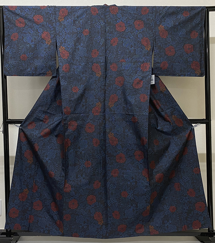 しなやかでスベリの良い大島紬織り生地で、黒に近い濃紺色の地織りに、花柄を青ネズ色とエンジ色で織り上げた品。身八つ口から下の後ろ幅一杯に正絹居敷き当てが付き、正絹白の衿裏が付いた手縫いの単衣仕立て。衿裏にはくるみホックが付いています。