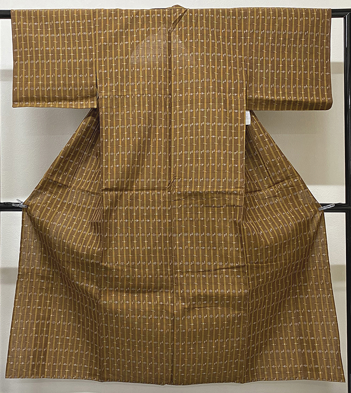 確りした張りのある琉球絣木綿織り生地で、金茶色の細縞柄を織り込んだ明るいこげ茶の地織りに、白ネズ色と小豆色で琉球絣の柄を織り込んだ品。お尻部分に共生地の居敷当てが付き、木綿白の衿裏が付いた手縫いの単衣仕立て。衿裏にはホック代わりに糸が付いています。