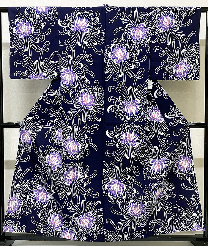 しなやかな手触りの木綿生地で、深い紺色の地色に染め、大きな乱菊の柄を白と薄紫色に珊瑚色を加えて染めた品。木綿白の肩当てが付き、肩当てから裾の背縫い沿いに木綿白の居敷当てが付いた手縫いの単衣仕立て。