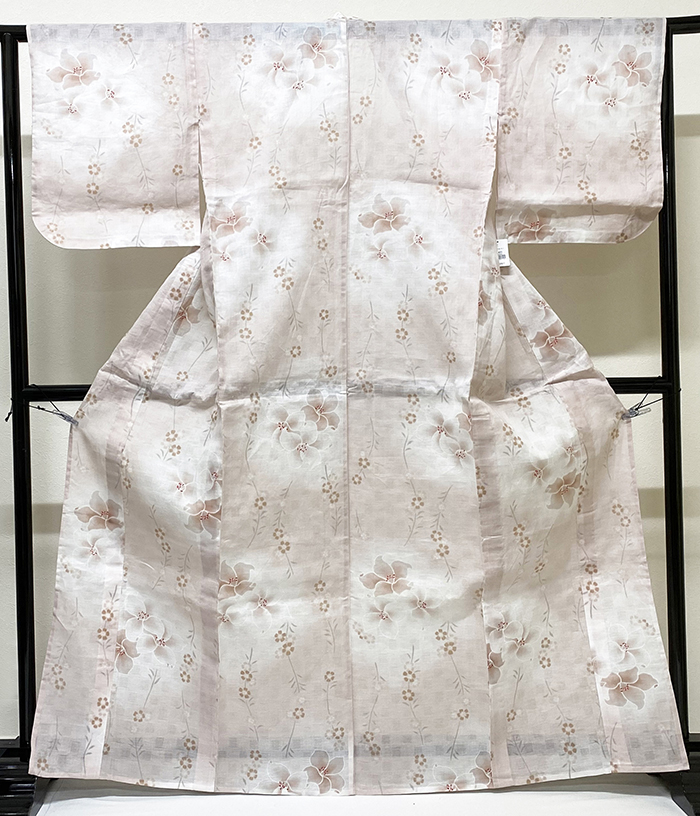 薄手で張りのある木綿85%、麻15%の交織生地で、市松に透けた地織りで、淡い藤ローズ色と白の暈しに染め、花柄をベージュ色や緋赤色を少し加えて染めした品。背伏せは共生地返しでミシン縫いの単衣仕立て。prideglide(プライドグライド)謹製、下前衿先裏にタグが付いています。