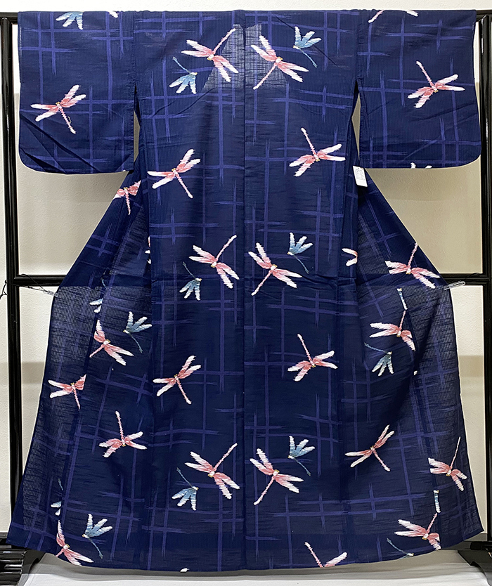 しなやかな手触りの細縞の一部が透けた織りの木綿生地で、黒に近い紺色の地色に染め、格子柄を青紫色で染め、トンボ柄を白と青ネズ色と黄赤色などで染めた品。背伏せは共生地返しで、ミシン縫いの単衣仕立て。