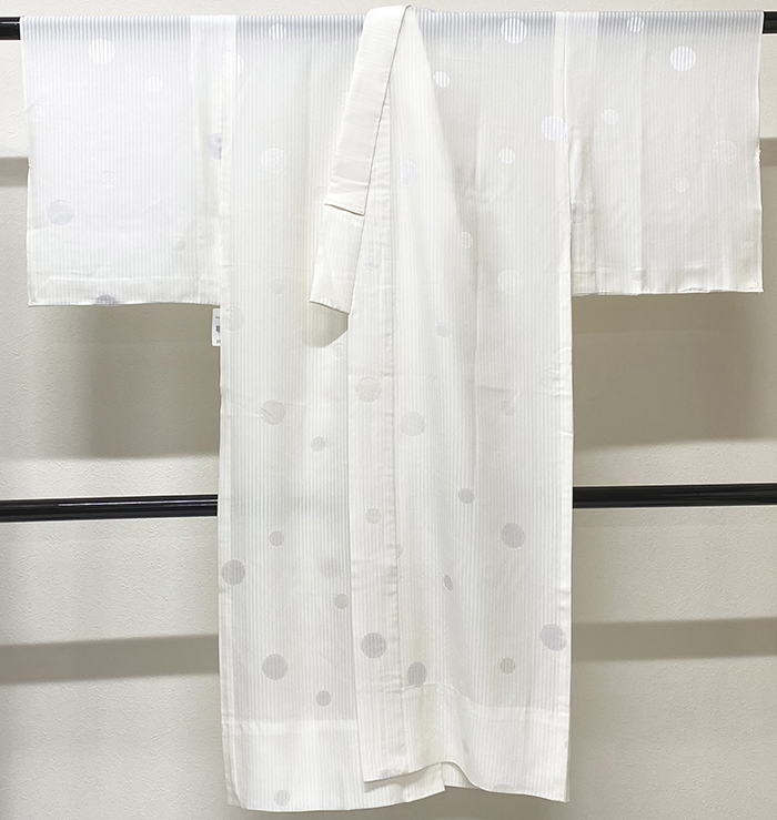 しなやかな手触りの縦に織り上げた平絽の地織りに丸柄を織り込んだ生地の白襦袢。背伏せは別生地が付いた単衣仕立てで、正絹白絽の半衿が付いています。手縫い仕立て。
