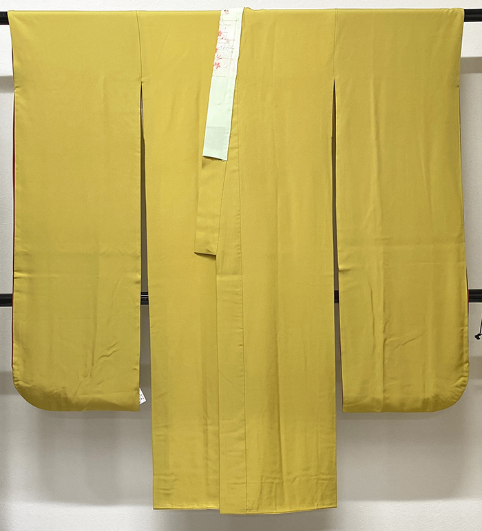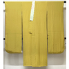 しなやかな手触りのパレス織り生地で、辛子色に近い金茶色無地に染めた品。正絹通し裏が付き、背伏せは共生地返しで、袖裏に鮮やかなエンジ色無地が付いた袖無双の袷仕立て。ポリエステル薄緑色暈しの刺繍半衿が付いています。手縫い仕立て。