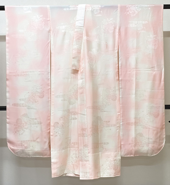 しなやかな手触りの花車と雲を織り込んだ紋綸子生地で、白と薄ピンク色で暈しで染めた品。 共生地の肩当てと背中から下の後幅一杯に正絹居敷当てが付き、袖裏に珊瑚色暈しが付いた袖無双の単衣仕立て。手縫い仕立て。