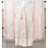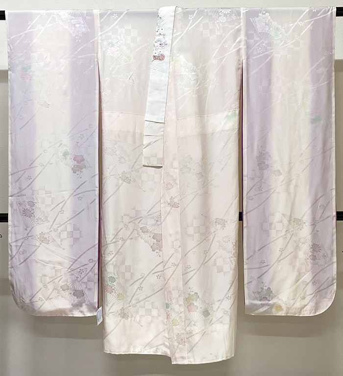 しなやかな手触りの扇と小花の柄を織り込んだ紋綸子生地で、淡いピンク色に暈し染めし、花柄の一部を薄緑色や黄色などで染めた品。背伏せは別生地が付き、袖裏に赤紫色暈しが付いた袖無双の単衣仕立て。ポリエステル白の刺繍半衿が付いています。えもん抜きが付いています。手縫い仕立て。