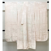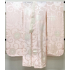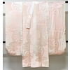 しなやかな手触りの大きな蔓花の柄を織り込んだ紋綸子生地で、淡いピンク色の地色に染め、花柄の一部を白の絞り染めで染めた品。背伏せは共生地返しで袖無双の単衣仕立て。手縫い仕立て。