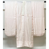 しなやかな手触りの大きなサヤガタの柄を織り込んだ紋綸子生地で、淡いピンク色に染めた品。腰から下の後幅一杯に正絹居敷当てが付いた袖無双の単衣仕立て。正絹白の半衿が付いています。オクミのない関東衿仕立てです。手縫い仕立て。