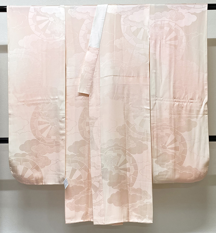 しなやかな手触りの雲と大きな源氏車の柄を織り込んだ紋綸子生地で、淡い珊瑚色濃淡暈しに染めた品。正絹通し裏が付いた袖無双の袷仕立て。手縫い仕立て。
