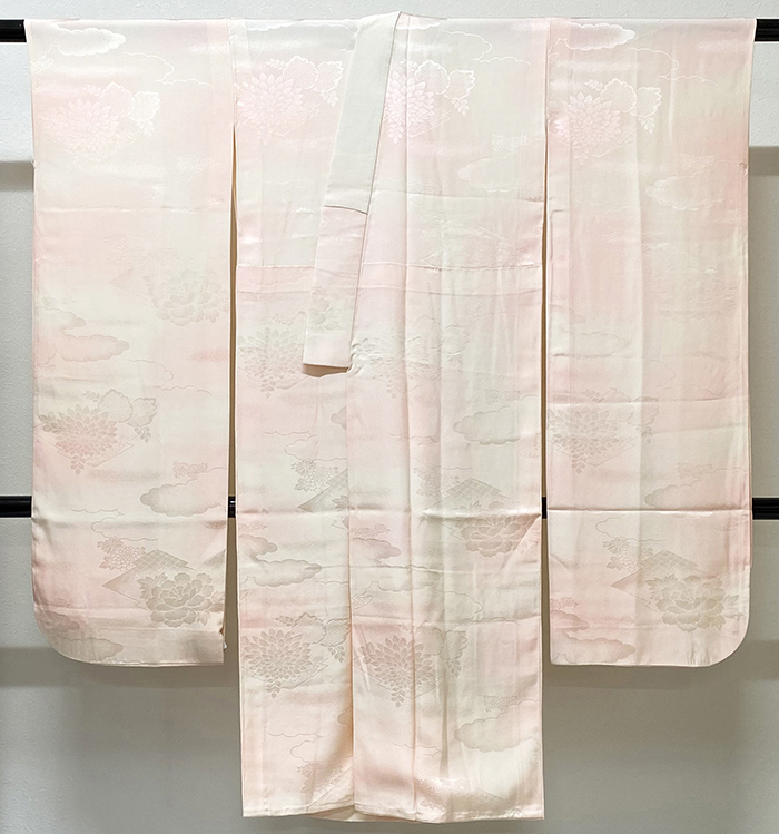 しなやかな手触りの雲や花柄を織り込んだ紋綸子生地で、淡い薄ピンク色暈しに染めた品。正絹通し裏が付いた袖無双の袷仕立て。正絹白の半衿が付いています。手縫い仕立て。