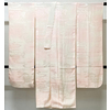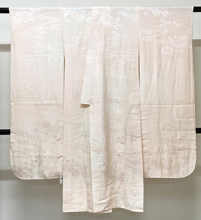 しなやかな手触りの流水花柄を織り込んだ紋綸子生地で、淡いピンク色で濃淡暈しに染めた品。正絹通し裏が付いた袖無双の袷仕立て。手縫い仕立て。