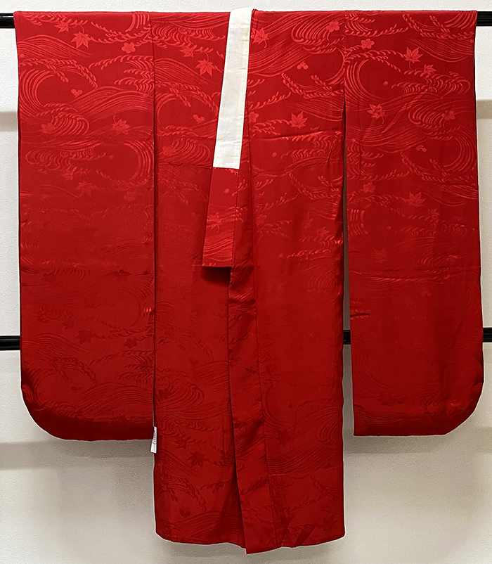 しなやかな手触りの流水花柄を織り込んだ紋綸子生地で、エンジ色に染めた品。背伏せは共生地返しで、袖無双の単衣仕立て。