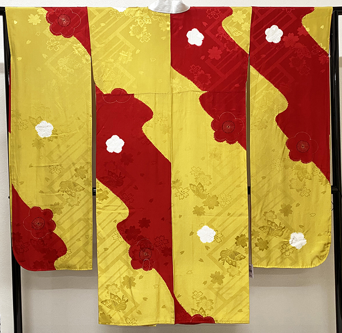しなやかな手触りの蝶と花柄を織り込んだ上質な紋綸子生地で、黄色みの金茶色に鮮やかな赤の桶絞りで染め分けし、花柄を白の絞り染めと、大きな花柄を黒や金彩で染めた品。正絹通し裏が付いた袖無双の袷仕立て。手縫い仕立て。