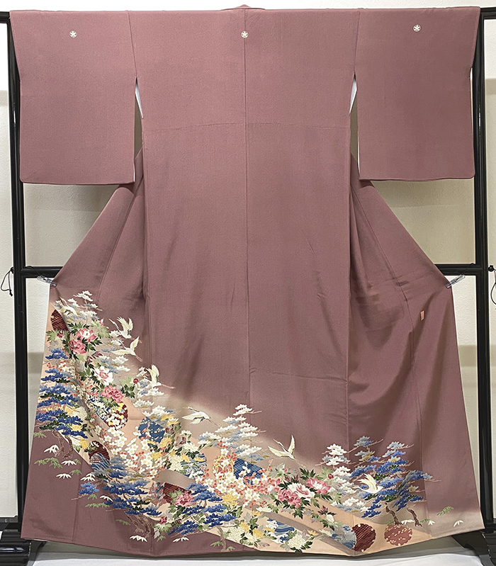 確りとした良い手触りの変わり一越の生地をやわらかなくすんだ小豆色に地染めし、上前からの花や鶴などの柄を緑色や青色・黄色・白色などの本加賀糸目友禅で丁寧に重ね染めした品。八掛けは正絹表色無地でオクミ裏に柄を置き、胴裏は正絹が付いた手縫い仕立て。正絹淡いクリーム色の比翼が付いています。大村洋子作、下前オクミに作家落款があります。