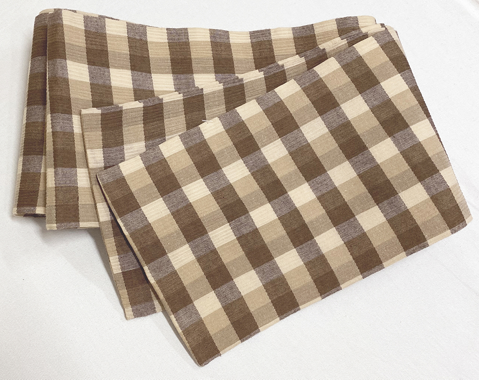 しなやかな手触りの縦シボに織り上げた木綿織り生地で、薄茶やこげ茶色濃淡の格子柄を織った、両面同柄の品。