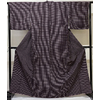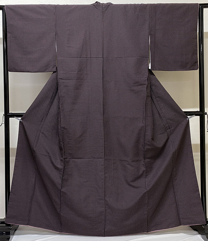しなやかな手触りのポリエステル一越の生地を赤紫色に地染めし、格子柄を黒で重ね染めした品。八掛けはポリエステル藤ローズ色無地で胴裏もポリエステルが付いています。ミシン縫い仕立て。
