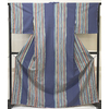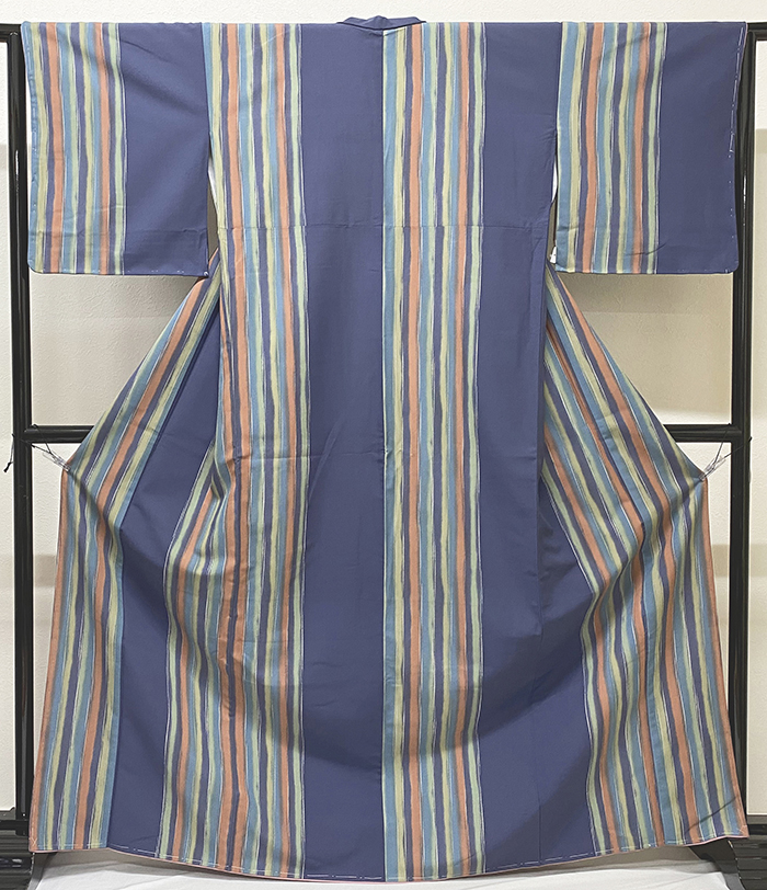 しなやかな手触りのポリエステル一越の生地をくすんだ青紫色で地染め、縞柄をくすんだ青色と黄赤色・金茶などの暈しで染めた品。八掛けはポリエステル藤ローズ色無地で胴裏もポリエステルが付いています。衿裏にはホック代わりに糸が付いています。ミシン縫い仕立て。