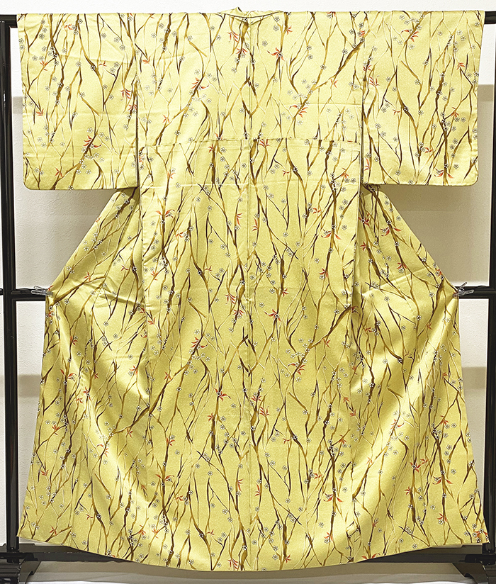 しなやかな手触りの霜降り織りのポリエステル綸子の生地を金茶色濃淡に地染めし、枝花の柄をこげ茶色や黄赤色・白などで重ね染めした品。八掛けはポリエステルくすんだ黄色暈しで胴裏もポリエステルが付いています。手縫い仕立て。