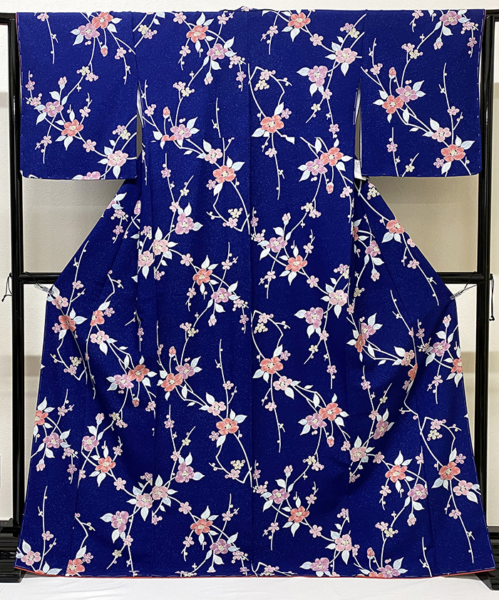 しなやかな手触りのポリエステル一越の生地を紺色の霜降りに地染めし、枝花の柄を青磁色と赤紫色・黄赤色・金茶などで重ね染めした品。八掛けはポリエステル黄赤色暈しで胴裏もポリエステルが付いています。手縫い仕立て。さんび謹製、下前衿先裏にタグがあります。