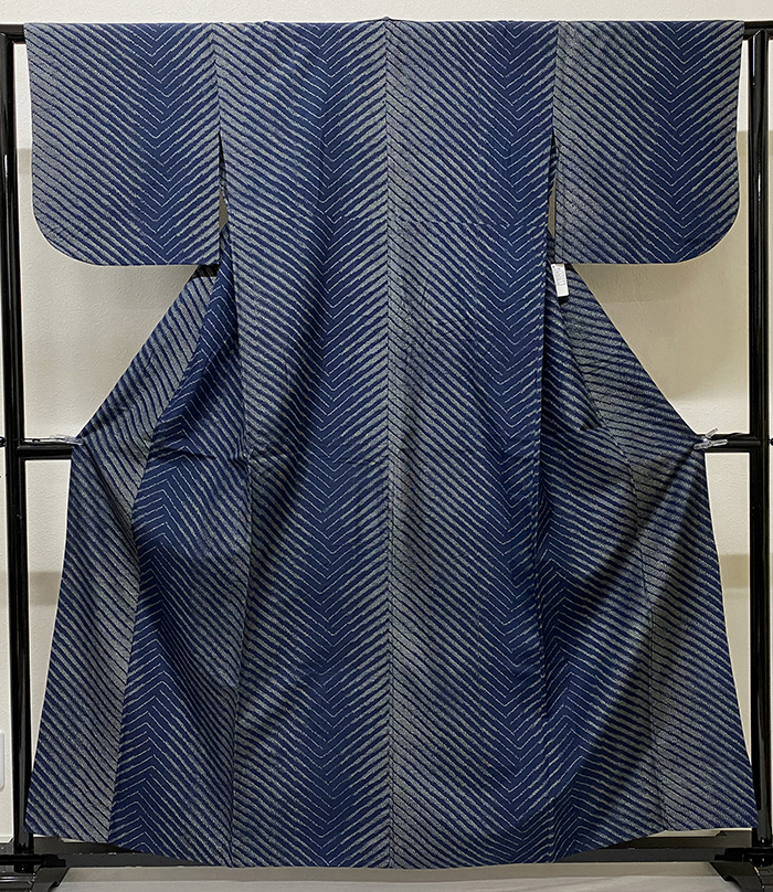 確りとした手触りの小さなフシを織り込んだ紬織りで、紺色の地織りに、斜め柄を白で重ね織りした品。背伏せは別生地が付き、ポリエステル白絽の衿裏が付いた手縫いの単衣仕立て。