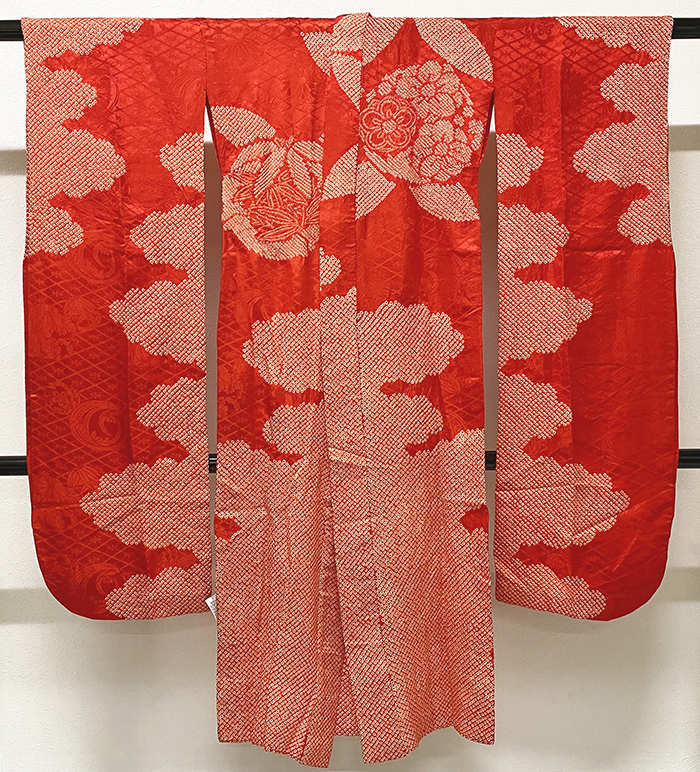 しなやかな良い手触りで花サヤガタの地柄を織り込んだ紋綸子の生地を赤色に地染めし、花や雲などの柄を白の鹿の子絞りで重ね染めした品。背伏せは共生地返しで、袖裏に暈しが付いた袖無双の単衣仕立て。手縫い仕立て。オクミのない通し衿(関東衿)仕立てです。